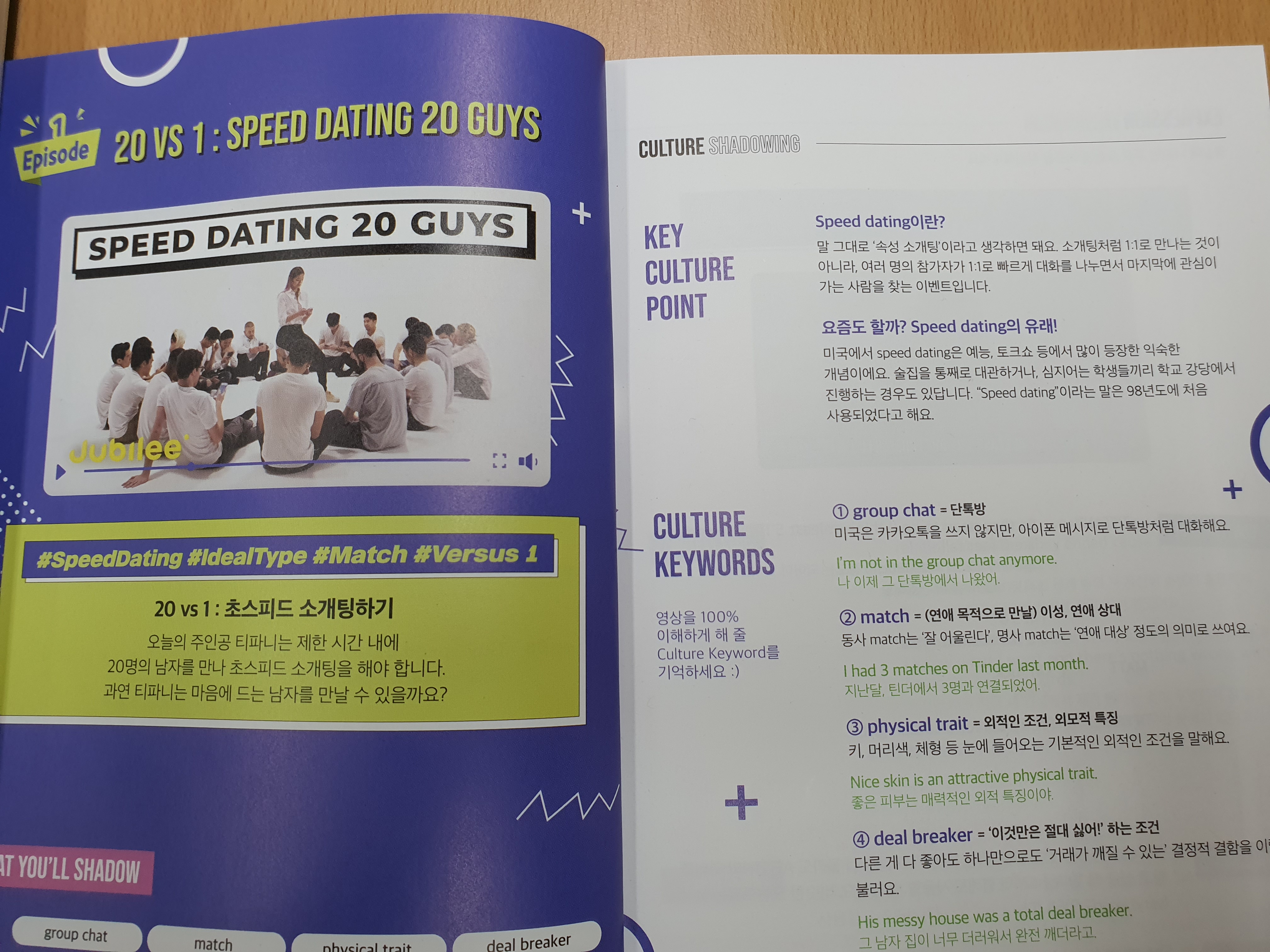 먼저 Jubilee 영상을 보고 빅토리아쌤과 쉐도잉북으로 컬처쉐도잉 - 익스프레션쉐도잉 - 패턴쉐도잉 - 인토네이션쉐도잉을 한다. 마지막으로 스피킹 트레이닝은  데이비드쌤과 함께 롤플레잉하며 회화연습을 한다.