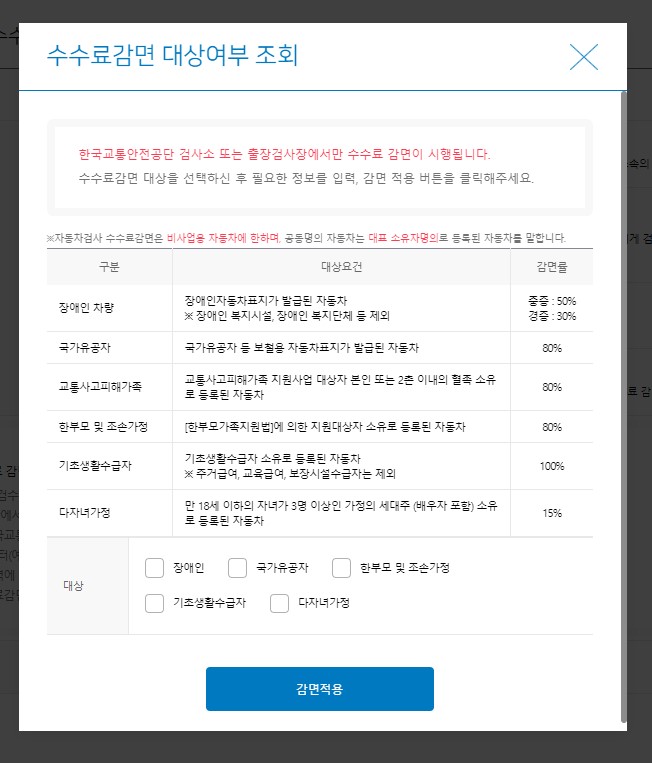 장애인차량, 국가유공자, 한부모 및 조손가정, 교통사고 피해 가족, 기초 생활수급자, 다자녀 가정에 해당한다면 각각 해당 감면률에 따라 감면 적용을 받을 수 있습니다.