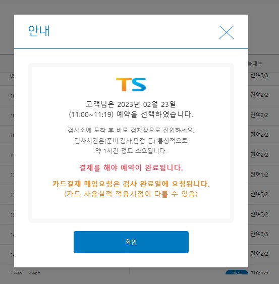 해당 검사소의 예약가능한 일자와 시간을 선택합니다. 결제를 하라는 팝업이 뜹니다. 결제를 진행하겠습니다.