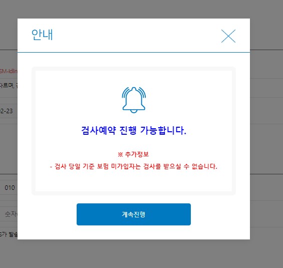 차량 번호와 소유주의 정보를 입력하니 검사예약 진행 가능여부에 대한 팝업이 뜹니다. 계속 진행을 눌러줍니다.
