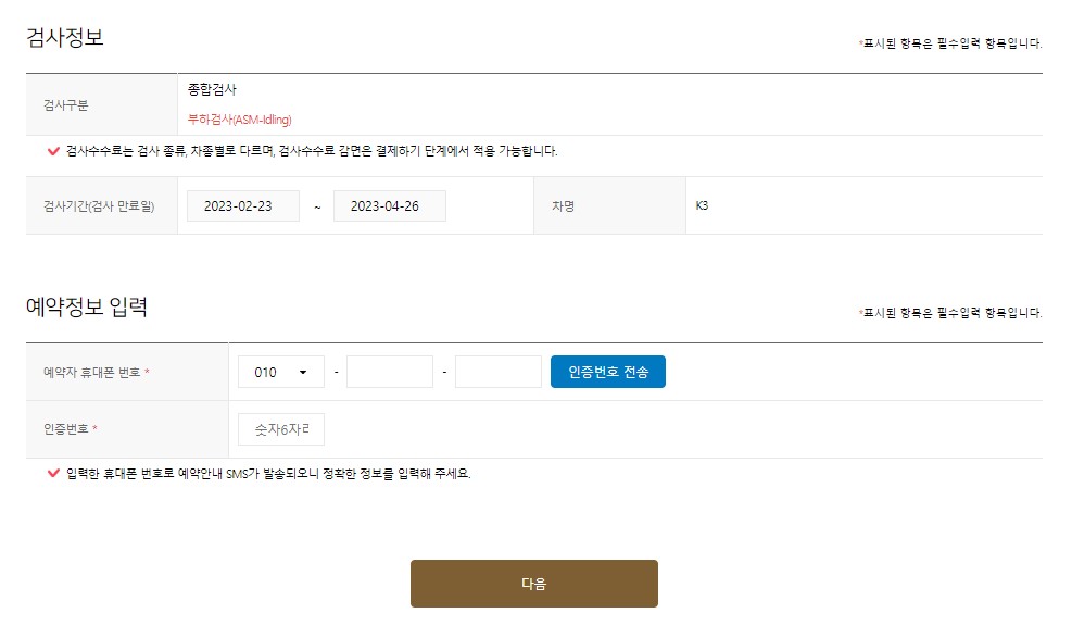검사기간과 차명이 뜨고 예약정보 입력란에는 휴대폰 인증을 거쳐야합니다.